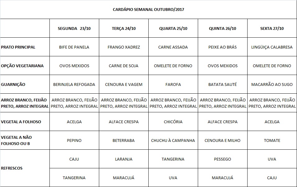 Você está aqui: Página Inicial / Nutrição PRAE(erro) / Cardápios RE / 23-10 a 27-10-17 modif.