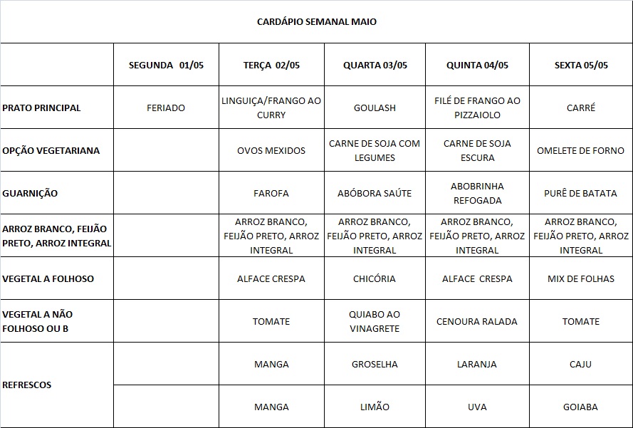 Você está aqui: Página Inicial / Nutrição PRAE(erro) / Cardápios RE / cardápio 02 a 05-05-17