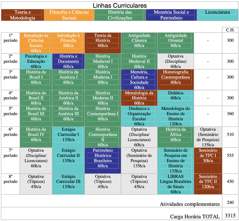 O currículo da Licenciatura tem a carga horária total de 3315 h, com 182 créditos, a serem integralizados em no mínimo 08 semestres e no máximo 12 semestres. A grade curricular da Licenciatura prevê a consecução de 35 disciplinas/atividades obrigatórias, que correspondem a 117 créditos teóricos, ou 1755 h/a, e 11 créditos práticos, ou 330 h/a; 08 disciplinas/atividades optativas, ou 23 créditos teóricos, que correspondem a um total de 345 h/a, e 08 créditos práticos, ou 240 h/a, divididas necessariamente em 03 disciplinas teóricas, 03 Tópicos Especiais e 02 Seminários de Pesquisa; 15 créditos (sendo 03 teóricos e 12 práticos), i.e., 405 h de Estágio Curricular Obrigatório e 08 créditos (240 h) em Atividades Complementares. A estrutura curricular organiza-se em torno de 05 linhas curriculares: Teoria e Metodologia, Filosofia e Ciências Sociais, História das Civilizações, Memória Social e Patrimônio e Licenciatura.