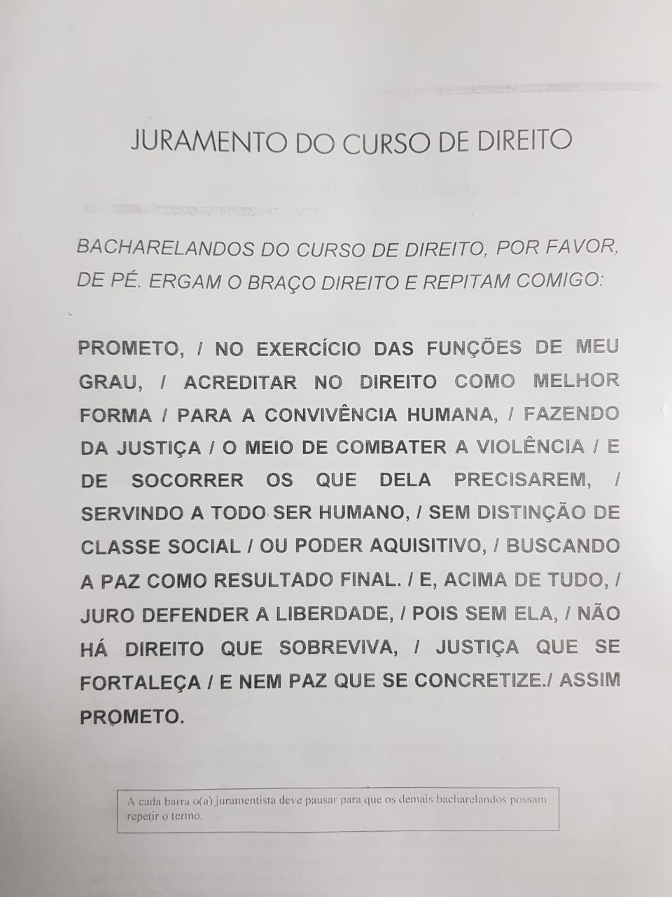 Texto do juramento do Curso de Direito da ECJ-CCJP-UNIRIO