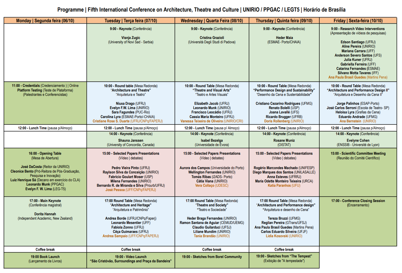 • A Dra. Dorita Hannah informou sobre o próximo lançamento do livro Perform/Design/Act. Performance Design Provocations. pela Routledge de Londres, em colaboração com Jon McKenzie e Olav Harslof, e a professora Dra. Cristina Grazioli lançou o livro Lumière Matière: variations et perspectives. Foi também relançado o livro O Patrimônio Cultural Industrial do Rio de Janeiro: Portuária, São Cristóvão e Praça da Bandeira, de Evelyn Lima com colaboração de pesquisadores do Laboratório de Estudos do Espaço Teatral e Memória Urbana. Na tarde do dia 10 de outubro, após a Mesa-Redonda Arquitetura e Performance Design II seguida da conferência de Evelyne Cohen (Universidade de Lyon), realizou-se a reunião do Comitê Científico para avaliar as inovações e contribuições introduzidas pelos pesquisadores nacionais e internacionais que investigam os três temas da Conferência. O relatório final elaborado pelo Comitê Científico concluiu que: