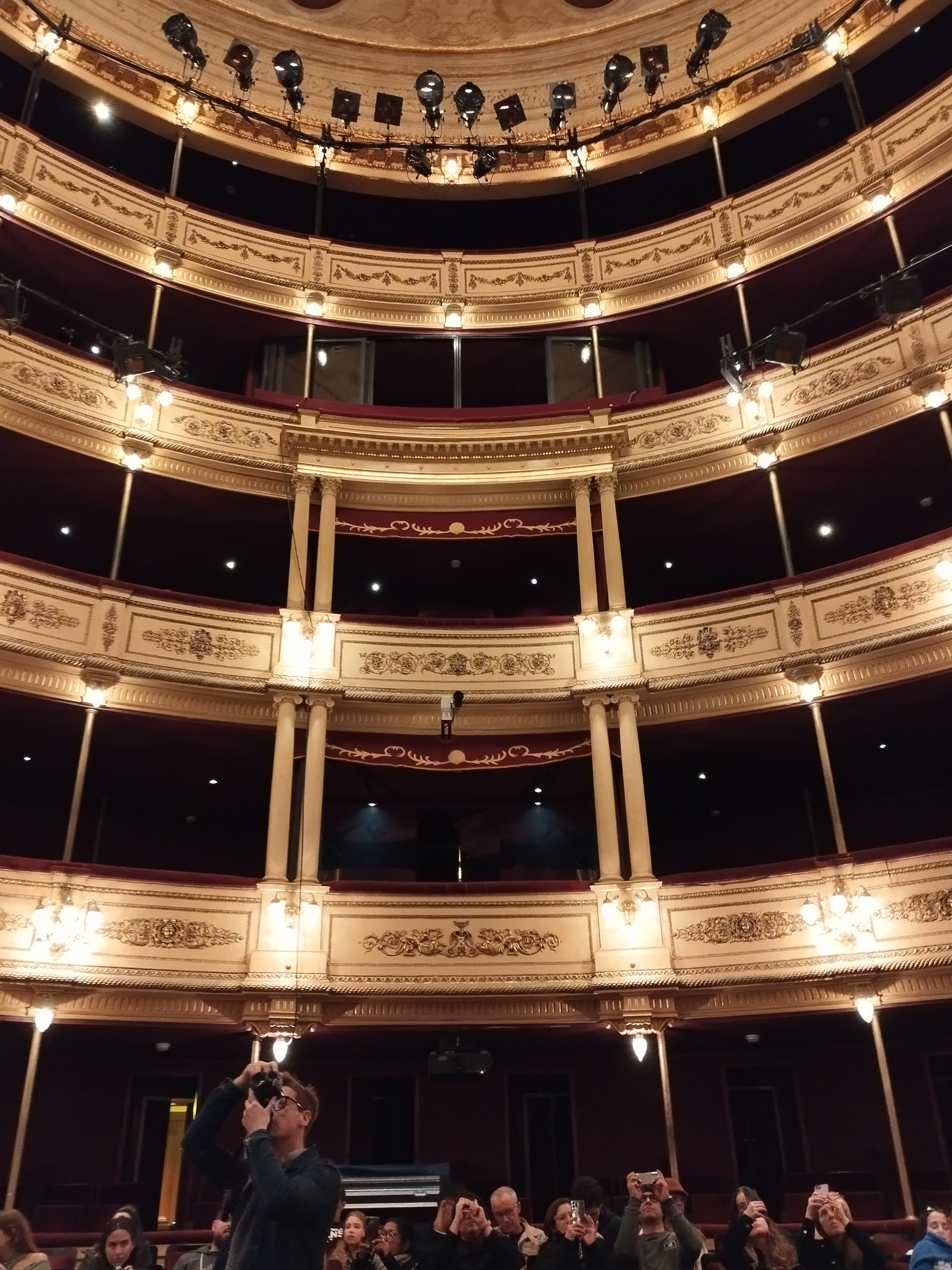 Obs - A capacidade do teatro é de 1200 lugares e a curva do balcão em ferradura apresenta-se com 5 níveis: palco bajo (plateia), tertúlia baja, tertúlia alta, casuela e paraíso.