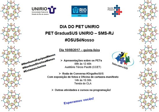 A equipe de professores, estudantes e profissionais que compõem o PET-GraduaSUS UNIRIO/CAP2.1, programa financiado pelo Ministério da Saúde, promovem nesta quinta-feira, dia 10, a Exposição Fotográfica e Roda de Conversa #OrgulhoSUS. As atividades, que integram o primeiro Dia PET, acontecem das 14h às 15h30, na Tenda do Centro de Letras e Artes (CLA).