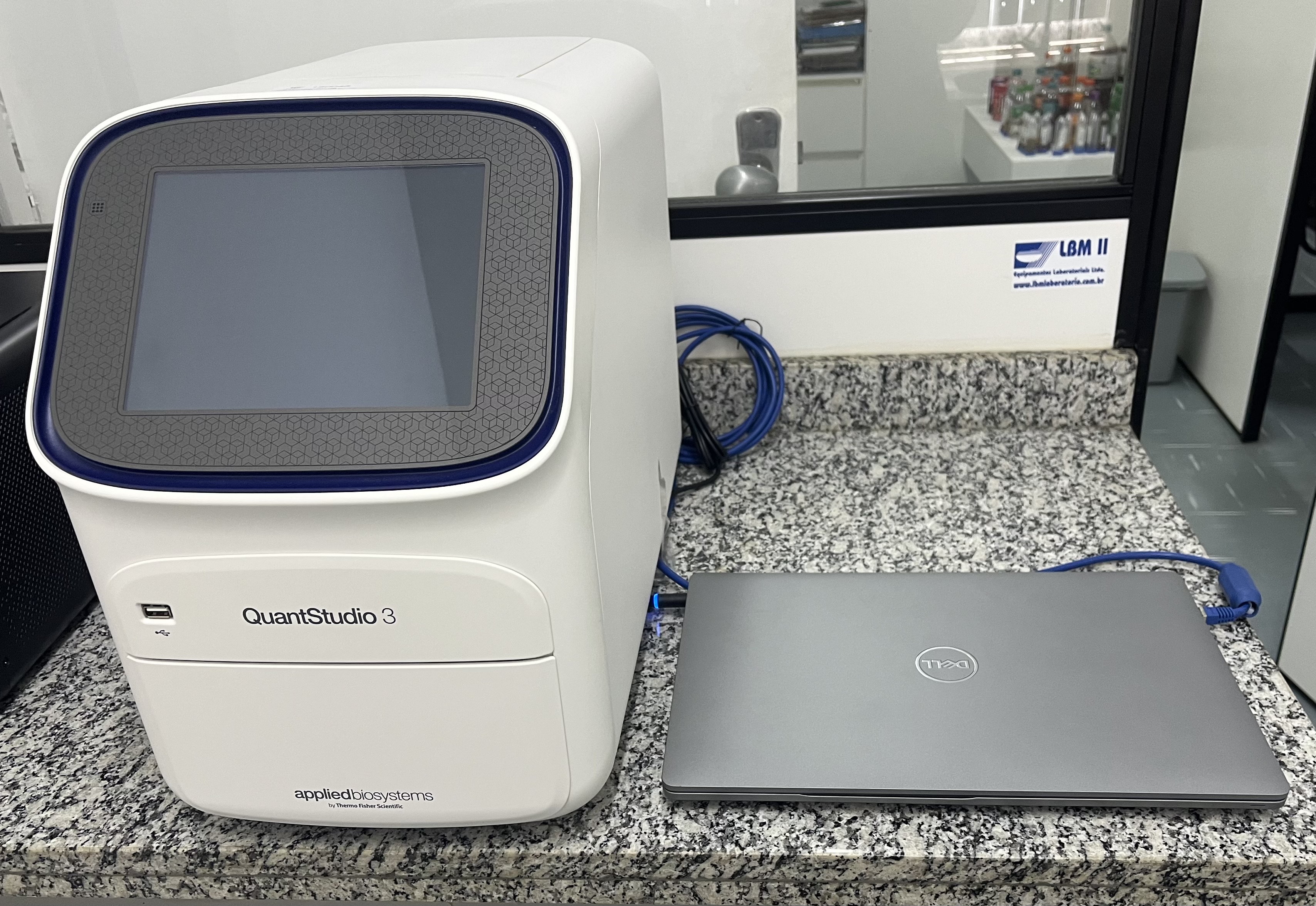 - Termociclador Applied Biosystems QuantStudio 3 – sistema de PCR em tempo real - ligado a um notebook Dell.