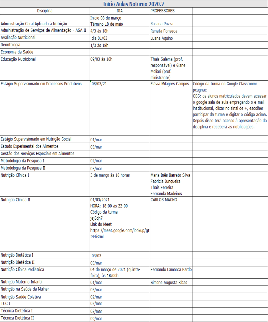 Início Aulas Noturno 2020.2