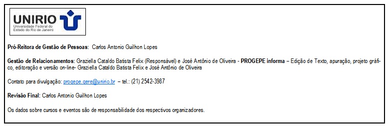 Neste mês de abril de 2017, o informativo virtual PROGEPE informa, da Pró-Reitoria de Gestão de Pessoas (PROGEPE), publica o 24º número e está incluído dentre as atividades do PDI (Plano de Desenvolvimento Institucional) da Universidade Federal do Estado do Rio de Janeiro (UNIRIO).