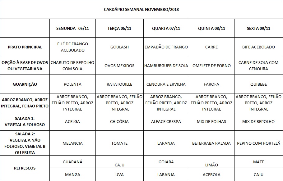 Você está aqui: Página Inicial / Nutrição PRAE(erro) / Cardápios RE PUPO / 05-11 A 09-11-18