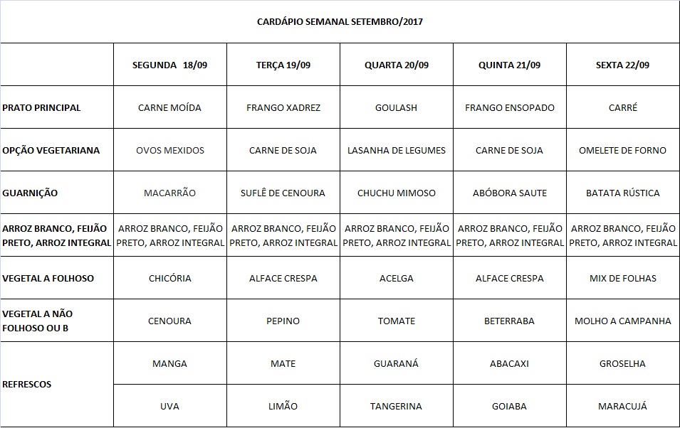 Você está aqui: Página Inicial / Nutrição PRAE(erro) / Cardápios RE / 18-09 a 22-09-17