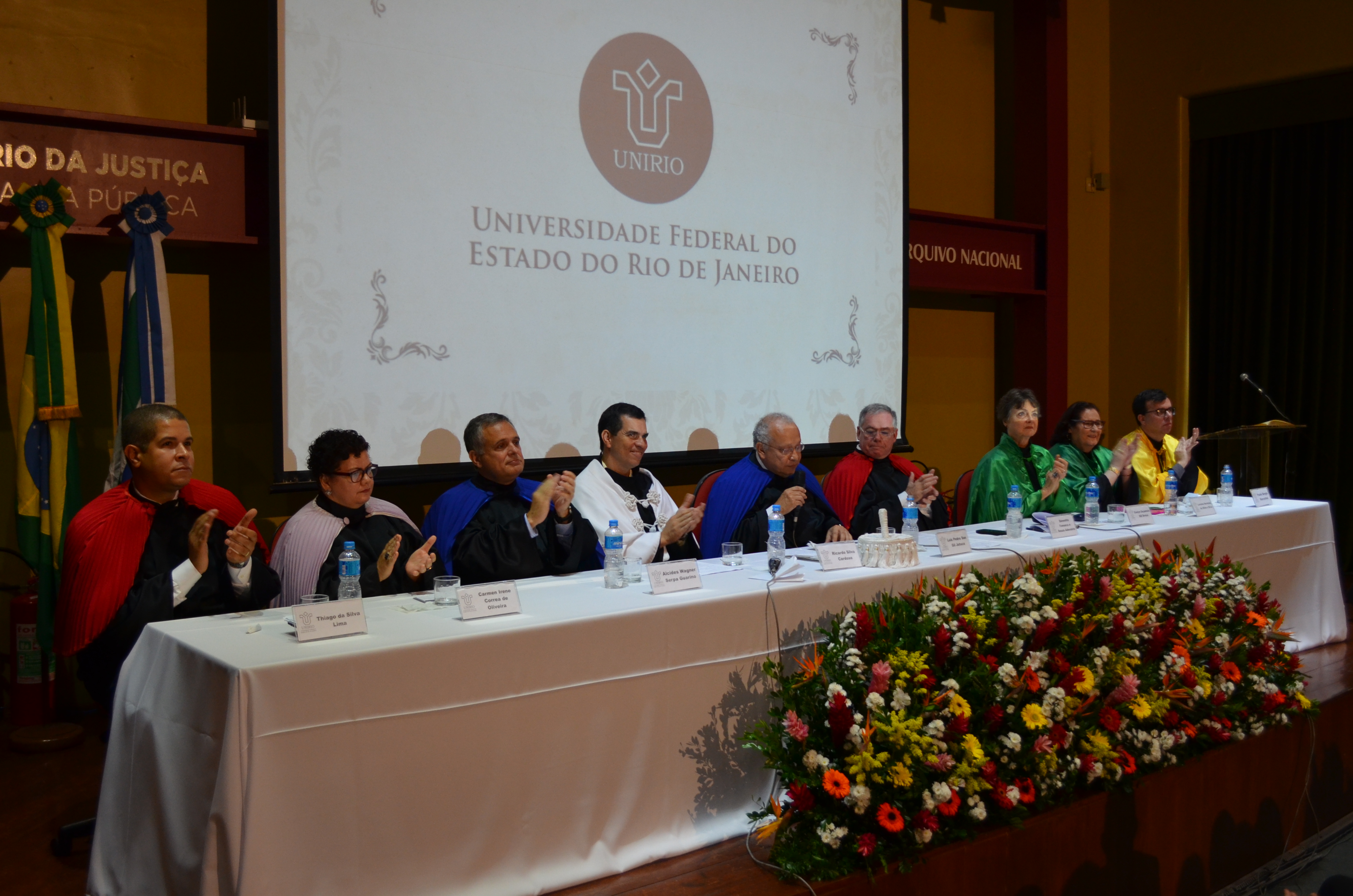 Mesa solene da cerimônia de transmissão do cargo de reitor (Foto: Comso)