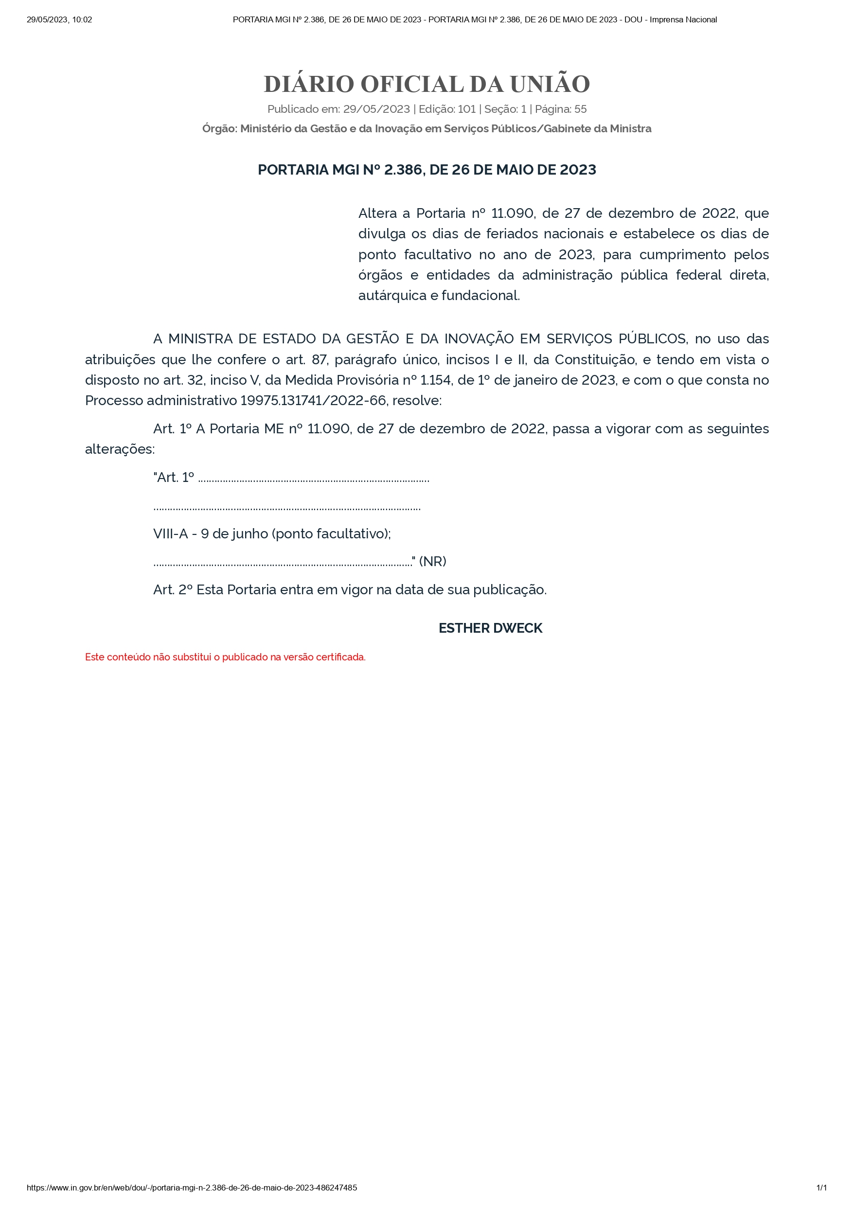 Dispõe sobre ponto facultativo no dia 09.06.2023.