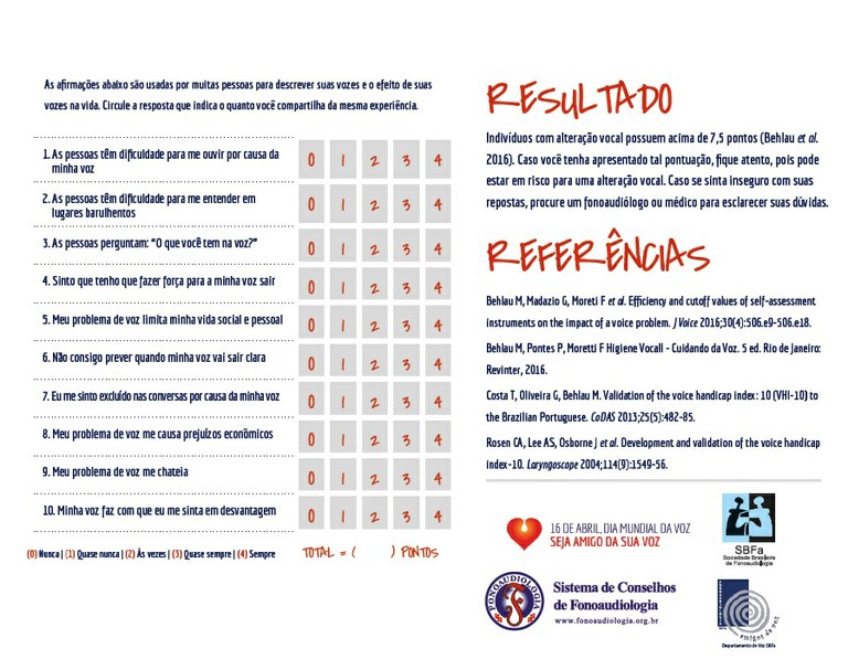 O evento realizado pelo SAST teve como objetivo celebrar o dia Mundial da Voz, comemorado no dia 16 de abril, além de promover a conscientização sobre a importância da voz humana para a promoção da saúde assim como, prevenir e sensibilizar quanto ao aparecimento de sinais e sintomas de alterações favorecendo o diagnóstico precoce de doenças.