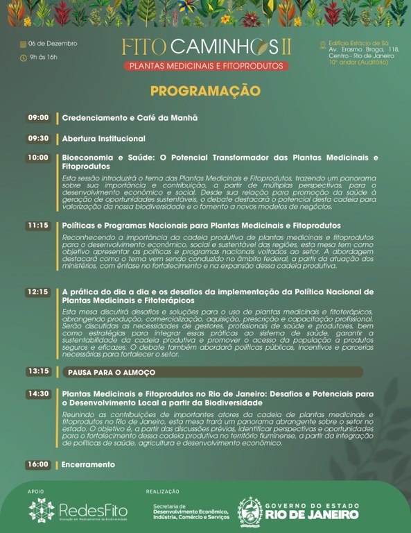 O Governo do Estado do Rio de Janeiro, por meio da Secretaria de Desenvolvimento Econômico, Indústria, Comércio e Serviços - SEDEICS, em parceria com a RedesFito da Fiocruz, realizará, no dia 06 de dezembro, o evento “Fitocaminhos II: Plantas Medicinais e Fitoprodutos”, na cidade do Rio de Janeiro.